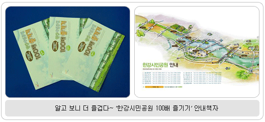 나서기 전 참고책자를 찾아보는 것도 좋겠다. 한강에 관한 모든 정보를 총망라한 이 책자는 서울시청 홍보관과 한강시민공원 12개 지구 사무소, 구청 민원봉사실, 한국관광공사 정보안내센터, 인사동 관광안내센터에서 시민들에게 무료로 배포하고 있다. 시민들이 대중교통 또는 승용차를 이용하여 한강에 쉽게 올 수 있는 방법과 한강시민공원 12개 지구의 주요시설 현황과 연락처가 자세히 수록되어 있다. 또한 시민들이 많이 이용하는 인라인, 자전거, 마라톤 코스와 안전 수칙에 관한 정보도 제공하고 있다. 이와 함께 한강에서 가족 단위로 즐길 수 있는 레저 및 스포츠시설 및 자연생태공원(여의도, 강서, 고덕) 등에 대한 다양한 정보를 담고 있어, 한강 나들이를 나설 때, 아이들을 위한 교육자료로 활용하면 좋을 듯하다. 특히 책자의 형태를 폴더형(25×16㎝)으로 개선, 휴대가 편리하도록 개선했으며, 8월 중순부터는 한강시민공원 홈페이지(http://hangang.seoul.go.kr/)에서도 전자책(e-book)으로 만나볼 수 있다. 외국인들을 위한 영문판은 9월 초쯤 발간·배포할 예정이다. 문의 : 한강시민공원사업소 ☎ 3780-0772 |