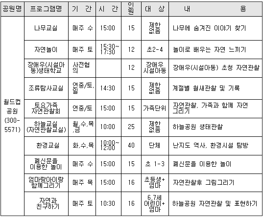 홈페이지(parks.seoul.go.kr)에서 확인할 수 있다. 단 월드컵공원 프로그램은 25일 오후 1시, 길동생태공원