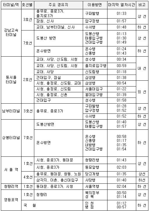 해마다 전쟁을 방불케 하는 추석 연휴 귀성길과 귀경일. 올해는 그나마 연휴가 길어 조금 나을까 기대도 해보지만 마음이 놓이질 않는다. 서울시는 추석연휴 동안 귀성객, 심야 귀경객 및 성묘객에게 교통편의를 제공하기 위해 추석연휴 특별교통대책을 수립해 시행키로 했다. 우선 추석날인 10월6일부터 연휴 마지막 날인 8일까지 지하철과 버스의 막차시간을 다음날 새벽 2시까지 연장 운행한다. 지하철의 경우 자정 이후 20~30분 간격으로 다음날 새벽 2:00(종착역 도착시간 기준)까지 운행하며, 버스의 경우 주요역과 터미널을 경유하는 64개 노선 1,938대에 대해 다음날 새벽 2:00(주요 역, 터미널 종점방향 막차 통과시간 기준)까지 연장 운행한다. 또 개인택시 부제를 10월5일 04:00부터 9일 04:00까지 해제해 연휴기간 시민들의 택시 승차가 쉽도록 했다. 임시 버스전용차로 운영 현재 버스전용차로가 시행중인 곳은 신반포로의 고속터미널(센트럴시티) → 잠원IC(편도, 1.2㎞) 구간과 경부고속도로 서초IC ↔ 양재IC(양방향, 2.6㎞) 구간이다. 추석 연휴동안 임시로 지정되는 곳은 남부순환로 남부터미날에서 서초IC(양방향, 0.5㎞) 구간, 사평로 삼호가든사거리에서 반포IC(왕복, 0.6㎞) 구간이다. 이와함께 귀성객들에게 교통정보를 제공하기 위해 10월4일 10:06시부터 10월9일 새벽 05:00까지 교통방송에서 전일 생방송을 진행하며 도로전광표지 54기를 이용해 고속도로 소통정보도 제공한다. 성묘객들 위해 무료셔틀버스 운영 성묘객들의 교통편의를 위해서 용미리, 벽제, 망우리 지역을 운행하는 버스 운행횟수를 99회 늘렸으며 용미리묘지 내에서는 무료셔틀버스를 4대 운행할 예정이다. 시외·시내버스의 경우 귀성객의 대중교통 이용편의를 위해 운행회수를 평상시보다 804회(19.5%) 늘려 29,237명(43.3%)을 추가 운송할 수 있도록 했다. 이러한 수송대책과 함께 서울시는 추석연휴 기간 중 주요 역, 터미널, 백화점 주변 택시 불법운행과 불법 주·정차를 특별 지도·단속한다. 또 10월3일 오전 09:00부터 10월9일 오전 09:00까지 24시간 특별교통대책상황실도 운영된다.