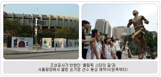 메달리스트 사진, 핸드프린팅, 손기정 선수 동상 등 전시 서울시는 88 서울올림픽 개최 장소인 잠실종합운동장 주경기장 앞에 ‘올림픽 스타의 길’을 조성한다. 길이 165m 구간에 조성되는 스타의 길에는 23개의 전시벽이 설치되어, 메달리스트들의 영광의 순간을 담은 사진, 핸드 프린팅, 상징 전시물 등을 볼 수 있다. 특히 우리나라 첫 금메달리스트인 고(故) 손기정 선수의 동상이 ‘올림픽 스타의 길’에 세워진다. ‘올림픽 스타의 길’은 현재 공사가 진행되고 있으며, 12월 말 완공되어 내년부터 시민들에게 개방된다. 문의 : 서울시 체육시설관리사업소 ☎ 2240-8963 |