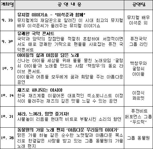 이밖에도 백창우와 굴렁쇠 아이들이 꾸미는 ‘동요콘서트’, 섹소폰 연주자 이정식의 ‘재즈로 하나되는