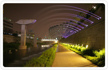 의전행렬을 상세하게 기록한 것이다. 왕실 기록화이자 한 폭의 풍속화를 연상시키는 이 반차도는 당시 행차의 격식과 복식, 의상, 악대구성 등을 살필 수 있는 귀중한 역사적 가치를 지니고 있으며 조선시대 기록문화의 보고라 할 수 있다. 반차도는 프롤로그, 서울의 옛 지도인 수선전도, 반차도, 에필로그의 4개 부분으로 구성되어있으며, 한글과 영문 해설판이 있어 우리 문화에 익숙치 않은 일반인이나 외국인들도 거부감 없이 감상할 수 있다. 고사분수와 문화의 벽 고사분수 주변에는 야외무대와 천변 스탠드, 문화의 벽, 색동벽, 조선 영조 때의 개천 준설 그림인 준천도, 영조어필 등이 조성돼 있어 청계천 완공 이후엔 동대문 상권과 이어지는 문화체험 공간으로도 인기를 끌 전망이다. 특히 문화의 벽은 자연·환경을 주제로 한 현대 미술가 5인의 작품으로, 수변에서 현대 미술을 즐길 수 있다는 점에서 매력적으로 다가온다. 작품 크기는 가로 10m, 세로 2.5m로 오간수문 상류에 위치해 있다.