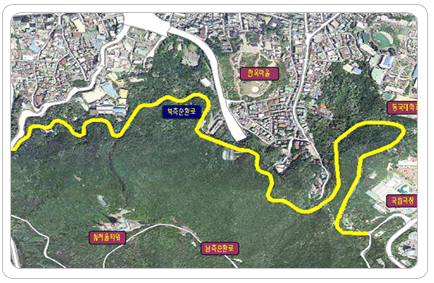 북측순환로 아스팔트 걷어내고 탄성포장으로 교체 남산 순환로의 아스팔트를 걷어내고 육상트랙과 같은 탄성포장으로 교체해 ‘달리고 싶은 남산 길’로 조성하며 N서울타워 앞 팔각정 광장도 전통이 살아있는 산뜻한 문화공간으로 새 단장하게 된다. 또 현재 진행 중인 목재펜스 교체 사업의 일부 구간에는 조팝나무, 사철나무 등 키 작은 나무를 촘촘히 심어 생울타리로 조성, 자연미를 보탤 계획이다. 서울시는 많은 시민들의 산책 및 조깅코스로 각광받고 있는 남산 북측순환로의 8m폭 아스팔트 도로 중 한쪽면(폭 4m)의 아스팔트를 걷어낸 뒤 탄성포장을 해, 달리거나 걷기 좋도록 만들 계획이다. 나머지 절반은 제설차량 등 비상용 차량의 통행에 대비해 남겨두기로 했다. 공사는 14억 원을 들여 내년 3월에 착공해 6월 말완공된다. 남산 북측순환로는 1990년대 ‘남산 제모습 가꾸기’사업의 일환으로 1991년 차량통행을 막고 보행자들을 위한 공간으로 개방된 후 매년 130만명의 지역주민, 직장인 등이 즐겨 찾는 서울 도심의 숨겨진 명소이다. 그러나 예전 차량통행로 시절부터 있던 아스팔트 포장이 남산의 이미지와 맞지 않을 뿐더러, 조깅하는 시민들에게 부담을 주는 문제점이 있었다.
