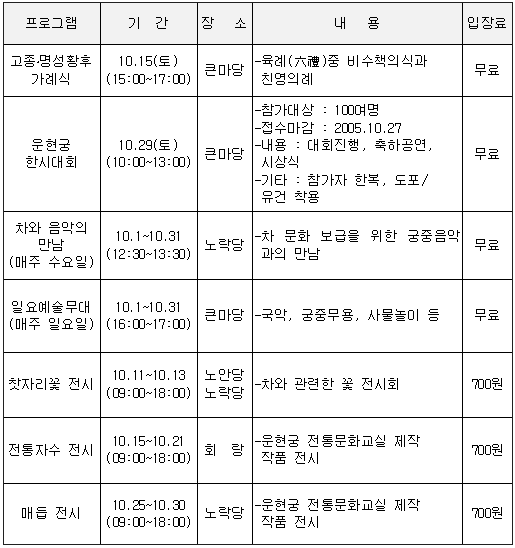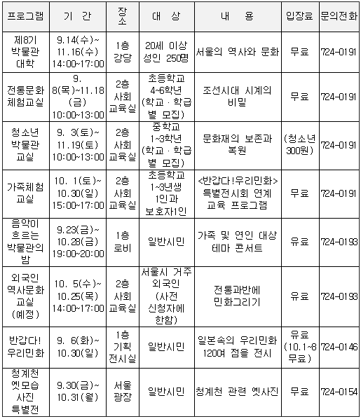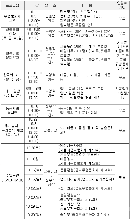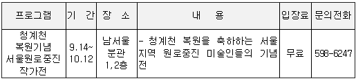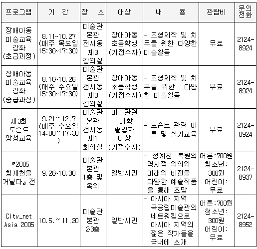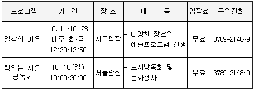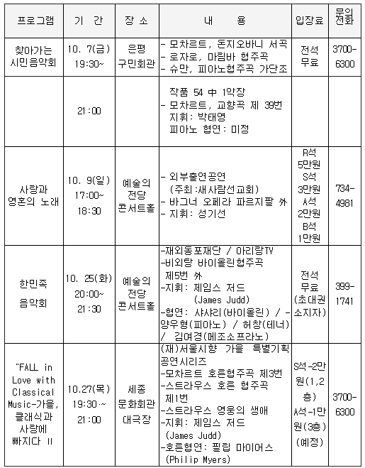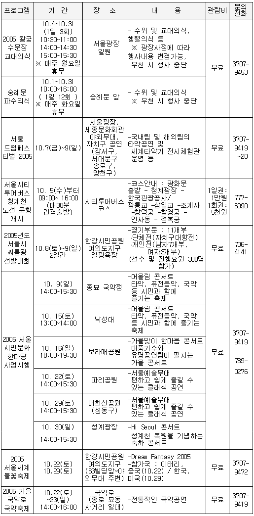 한편, 광복절과 청계천 새물맞이 행사 때 야외 공연과 '정명훈과 서울시향, 새로운 출발' 등으로 시민들을 사로잡았던 정명훈 지휘의 서울시립교향악단 연주회가 10월에도 여러차례 준비돼 있다. 7일에는 은평구민회관에서 ‘찾아가는 시민음악회’가, 25일에는 예술의전당 콘서트홀에서 ‘한민족음악회’가 무료로 공연된다. 9일에는 ‘사랑과 영혼의 노래’가 예술의전당 콘서트홀에서, 27일에는 ‘클래식과 사랑에 빠지다Ⅱ’가 세종문화회관 대극장에서 열린다. ![]() ‘2005 서울 세계불꽃축제’도 10월 문화행사 중 놓치기 아까운 축제. 22일과 29일(토요일) 한강시민공원 여의도지구에서 열리며, 이태리와 중국은 22일, 우리나라와 미국은 29일 참가한다. 이밖에도 도슨트 관련 이론 및 실기교육을 실시하는 제3회 도슨트 양성교육이 서울시립미술관에서 21일부터 12월 7일까지 이어진다. 더불어 시민들의 사랑을 한몸에 받은 청계천에는 서울시티투어버스가 5일부터 운행되고 있다. 광화문을