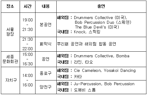 서울광장에서 개막…세종문화회관, 자치구 공연장에서 펼쳐져 두드리면서 느끼는 쾌감을 예술로 승화시키는 ‘서울드럼페스티벌 2005’가 오늘 개막하면서 올 가을 축제를 절정으로 이끈다. 전 세계 타악기가 총 출동하여 두드림으로 신명을 만들어내는 장관은 7일 저녁 7시부터 서울광장에서 시작된다. 이번 페스티벌은 서울광장과 세종문화회관 특설무대를 비롯해, 종로구, 강서구, 서대문구, 양천구 등의 자치구 공연장에서도 개최돼, 서울시 전역을 드럼의 향연장으로 만들 예정이다. 올해로 7회째를 맞는 ‘서울드럼페스티벌’은 예술성과 대중성 양면을 모두 충족시키고 있어, 소리와 리듬만으로 온 인류가 화합하고 공감(共感)하는 한마당을 연출할 것으로 기대된다. 그간 ‘공명, 신명, 감명’, ‘아리랑’, ‘빛, 소리, 인간’, ‘소리로 하나 되는 서울’ 등의 컨셉으로 행사를 진행하면서 생활 속의 축제로 자리매김해 왔기 때문에 더욱 관심이 고조되고 있다. 특히 올해에는 기량이 우수한 해외 7개 팀이 참가하고, 국내에서도 정상의 12개 타악 팀이 참가하여 활력 넘치는 공연을 펼칠 것으로 보인다. 서울광장에서 화려하게 막을 올리는 드럼페스티벌은 국내 채향순 무용단과 함께 미국, 대만, 프랑스 등 해외 팀과 공명, 도깨비 스톰 등의 국내 팀이 총 출연하는 Jam 공연과 환상적인 레이저 쇼 등으로 개막공연을 장식할 예정이다. 도깨비 스톰, 뿌리패, Knock 등 국내팀과 미국 블루 데블스, 프랑스 씨에 까멜레온 등 해외팀 참가 이번 페스티벌에는 ‘패밀리 콘서트’라는 타이틀로 창단된 ‘Knock', 한국의 도깨비를 소재로 익살, 재치, 유머를 담아 폭발적인 연주를 보여주는 창작 타악그룹 ’도깨비 스톰‘, 전래 농악을 현대적 감각에 맞게 재구성하여 세계적으로 호평 받고 있는 ’뿌리패‘를 비롯하여, 공명, 라인, 타오, 카타 등 국내 무대에서 사랑받고 있는 12개 타악 팀이 참가해 개성 넘치는 무대를 선사할 것으로 기대된다. 또 해외 팀으로는 미국 최고의 행진악대인 ‘블루 데블스’와 드럼과 섹소폰, 키보드, 베이스기타 등이 어우러지는 퓨전 타악의 정수 ‘드럼콜렉티브스’가 참가하며, 퍼포먼스와 타악 연주를 접목시켜 다양하고 재미있는 무대를 선사하는 프랑스의 ‘씨에 까멜레온’ 등이 참가한다. 이외에도 2명이 4명 이상의 연주 효과를 만들어내는 스웨덴의 전자 타악그룹 ‘밥 퍼쿠션 듀오’, 현대적으로 해석한 전통 라틴 리듬을 바탕으로 열정적인 연주를 들려주는 쿠바의 ‘붐바’, 아시아 대표로 참가하는 대만의 ‘주퍼쿠션’과 일본의 ‘야마다 다이코 & 요사이코 댄싱’ 등 총 7개 해외 팀이 참가해 수준 높은 공연을 보여준다. ‘타악 전시 체험관’에서는 1천여 종의 타악기 관람 및 체험 가능 이번 페스티벌은 서울광장에서는 7~9일 저녁 8시부터 10시까지, 세종문화회관 특설무대에서는 8~9일 양일간 오후 3시부터 4시 30분까지 공연이 펼쳐진다. 낮 시간에는 자치구 공연장으로 자리를 옮겨, 8~9일 오후 2~4시에는 종로구 아르코 예술극장 뜨락과, 강서구 방화 근린공원, 서대문구 서대문구청 광장, 양천구 계남공원에서 각각 공연할 계획이다. 부대행사도 짜임새 있게 마련되어 관람객들의 발길을 붙잡는다. 서울광장에는 ‘타악 전시 체험관’이 마련돼 미국, 라틴아메리카, 유럽, 아프리카, 아시아 등 세계 각지의 전통 민속악기와 드럼 세트, 짐베, 효과 악기, 전자 악기 등 1천여 종의 타악기가 관람객들을 맞이한다. 여기에서는 관람뿐만 아니라 전시된 라틴 타악기와 국악 민속악기, 오케스트라 타악기 등을 직접 연주해볼 수도 있어, 체험을 선호하는 관람객들의 요구를 만족시킬 것으로 보인다. 또 쓰레기통, PVC파이프, 냄비 뚜껑 등의 생활용품과 폐자재를 이용한 악기도 전시하고 이를 연주하는 체험 행사도 함께 마련한다. 9일 폐막식에서는 뿌리패의 공연과 해외 팀의 합동 공연으로 대단원의 막을 내린다. 모든 행사는 무료이며, 자세한 공연일정과 출연진 정보는 드럼페스티벌 홈페이지(www.drumfestival.org)에서 확인할 수 있다. - 문의 : 서울시 문화과 ☎ 02)3707-9419~20