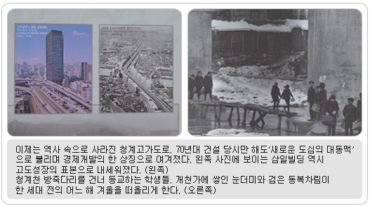 오간수문에 이르는 구간을 복개, 그 위에 도로를 만들었습니다. 복개공사는 그 뒤에도 계속되어 총 5.4km에 이르는 청계천이 시멘트