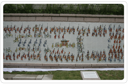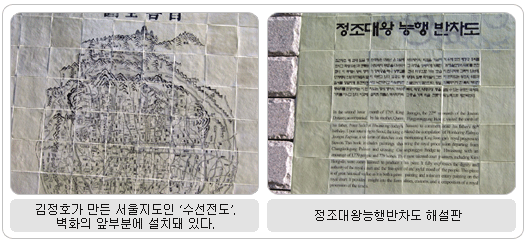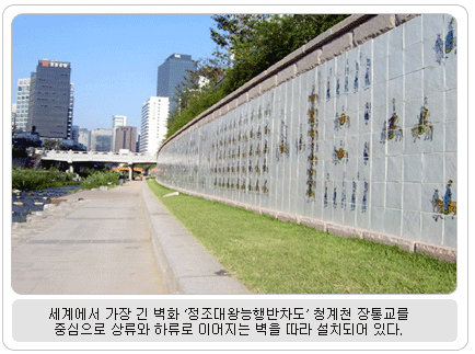 청계천에는 물과 꽃과 나무, 새와 곤충과 물고기 등 자연이 숨 쉴 뿐만 아니라 우리의 소중한 문화유산이 살아 숨 쉬고 있다. 그 대표적인 것이 ‘정조대왕 능행반차도(陵幸班次圖)’이다. 조선조 22대 왕 정조가 1795년 윤2월 모후 혜경궁 홍씨를 모시고 아버지 사도세자의 능(현륭원)이 있는 화성(경기도 수원시)으로 행차하는 모습을 그린 기록화이다. 그동안 부분만 보았을 뿐 전체를 한눈에 볼 수가 없었는데 이제 청계천을 거닐며 대작을 마음껏 감상할 수 있게 되어 기쁘기 그지없다. 정조대왕능행반차도는 조선조 최고의 화가로 꼽히는 단원 김홍도가 중심이 되어 그린 것이라 더욱 소중한 문화유산이다. 산수화, 인물화, 풍속화에 두루 능했던 단원은 사실묘사에 뛰어날 뿐만 아니라 조국에 대한 뜨거운 애정을 지녔던 화가였다. 정조의 어진(御眞)을 그리기도 한 그의 천재성은 정조 때에 이르러 활짝 꽃을 피웠다. 벼르던 끝에 주말 아침 청계광장에서부터 물길을 따라 걸어 내려가 작품과 만났다. 길이 186m, 높이 2.4m, 장통교를 중심으로 상류 쪽으론 광교, 하류 쪽으론 삼일교로 가는 중간까지 뻗친 반차도는 ‘세계에서 가장 긴 벽화’라는 기록이 무색치 않게 장대한 스케일을 자랑하고 있었다. 가로 세로 30cm의 백자도판 4천960매를 하나하나 연결, 마치 거대한 병풍을 펼쳐놓듯 벽면의 곡선을 살린 벽화 속엔 인마(人馬)의 행렬이 꼬리를 물고 이어져 있다. 선명한 색감 속에 드러난 세밀하면서도 거침없는 묘사는 기록화의 경지를 뛰어 넘어 빼어난 예술성을 보여준다. 행렬은 장엄하면서도 또 한편으로는 축제분위기 같은 분방함이 엿보인다. 인물들의 행색과 거동이 밝고 경쾌하여 조금도 경직되어 있지 않기 때문이다. 반차도에는 모두 1천779명의 인물과 779마리의 마필이 등장하고 있다. 반차도 도입부엔 고산자(古山自) 김정호(金正浩)가 만든 옛 서울시가 지도인 ‘수선전도(首善全圖)’를 배치함으로써 한층 의미를 깊게 했다. 긴 벽화를 따라가며 감상하다 보면 군데군데 작품 해설이 담긴 돌판을 만난다. 관람자들의 이해를 돕기 위해 반차도를 편의상 몇 부분으로 나누어 설명해 놓은 것이다.