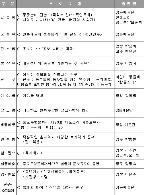 무형문화재 준보유자 명무 정명숙의 살풀이 등이 이어진다. 한편 국악축제에 앞서 오후 1시부터 국악로 인근 인사동과 낙원상가, 돈화문입구와 운현궁, 단성사 일대에서는 정동예술단, 한울소리, 대불전통연희단, 광명농악보존회 등 4개 풍물패들이 대단위 길놀이를 펼칠 예정이다. 문의 : 서울시 문화과 문화개발팀 ☎ 3707-9419, 9420 [국악로 국악축제 공연 프로그램]