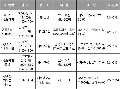 서울역사박물관 전화 : 724-0191~2 인터넷홈페이지 : http://www.museum.seoul.kr 교통안내 : 5호선