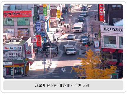 이대전철역~이화여대~신촌기차역 거리…보도개선, 가로시설물 정비 등 이화여대 주변이 환해졌다. 이전의 비좁고 답답했던 거리가 ‘찾고 싶은 거리'로 새 단장을 마쳤다. 서울시는 이화여대 전철역에서 이화여대 정문, 신촌 기차역에 이르는 500m거리를 쾌적하고 활기 넘치는 보행자 위주의 거리로 변화시켰다고 밝혔다. 이화여대 주변은 20대 여성들을 위한 카페와 옷가게 등이 밀집해 있어 하루에도 수많은 젊은이들이 찾는