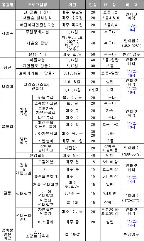 또 겨울방학을 맞는 어린이들을 위해서도 다양한 프로그램이 준비돼 있다. 장애우를 위한 프로그램도 눈에 띈다. 월드컵공원에서는 시설 장애우들을 초청해 ‘장애우 생태학교’를 열 예정이며, 길동공원에서는 ‘민들레 생태학교’란 이름으로 주변의 자연을 관찰하고 체험할 수 있는 프로그램을 진행한다. 참가를 원하는 이들은 25일부터 서울의 공원 홈페이지(parks.seoul.go.kr)통해 예약하면 된다. 참가비는 없으며, 선착순 모집.