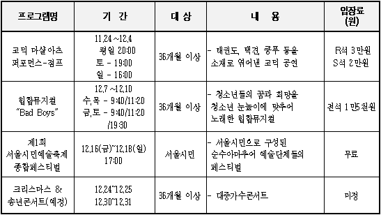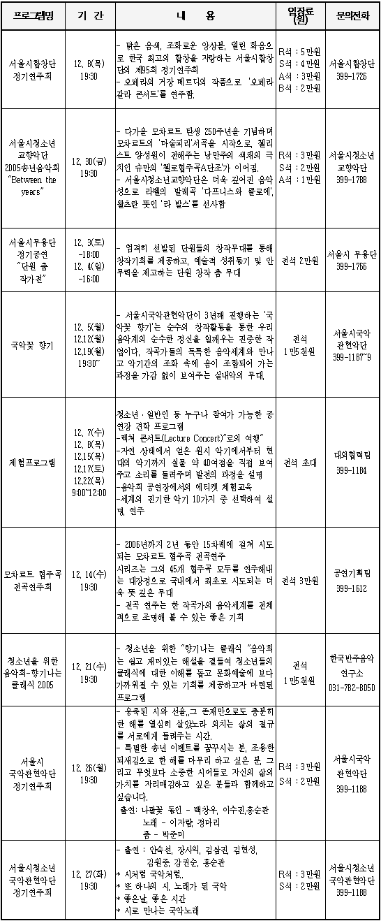 위주로 펼쳐진다. 문의 : 서울문화재단 문화사업국 ☎ 3789-2136 ▶ 12월 주요문화 프로그램 서울시 주최·공동 문화행사