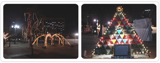 전시 트리 기증처, 서울의 공원 홈페이지에서 접수 불 켜진 창문으로 비치는 화목한 가족들의 그림자만 보아도 따스함을 꿈꾸게 하는 12월, 광화문 시민열린마당에는 소박한 소망으로 불을 밝힌 트리들이 전시돼 서울을 훈훈하게 만들고 있다. 작년에 이어 두 번째 열리는 ‘2005 소망 트리 축제’ 가 광화문 시민열린마당에서 오는 21일까지 개최된다. 참신한 아이디어의 시민 작가 14팀이 참가해 세상에 단 하나밖에 없는 ‘특별한 트리’를 만들어 전시하는 자리다. 참가팀이 6일부터 9일까지 현장에서 추위를 무릅쓰고 만들어낸 개성 넘치는 작품들은 그 소박한 소망으로 인해 관람하는 시민들까지도 숙연하게 만들고 있다. 가정의 폭력에서 빠져나와 새로운 시도를 계획하는 이들이 비폭력 세상을 염원하는 마음을 적은 소원종이를