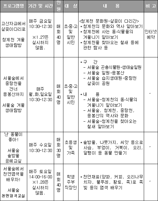숲 해설가와 함께 떠나는 청계천 생태탐방 등 신설 프로그램 14일부터 운영 야외에서의 활동이 줄어드는 겨울철이지만, 서울숲과 청계천에서는 추위도 이겨낼 수 있는 다양한 겨울철 프로그램을 마련, 실내에서 벗어나지 않으려는 청소년들을 밖으로 불러내고 있다. 오는 14일(토)부터 2월 말까지 매주 목요일을 제외하고 매일 진행되는 겨울철 신설 프로그램은, '숲 해설가들과 떠나는 청계천 겨울생태탐방', '서울숲 겨울생태탐방', '솔방울 공예교실', '천연염색교실' 등 네 가지이며, 서울숲과 청계천은 물론 중랑천과 응봉산까지 범위를 넓혀 활동하게 된다. 우선, 매주 금요일 열리는 '청계천 겨울생태탐방'은 고산자교에서부터 살곶이 다리로 이동하면서 모래톱,