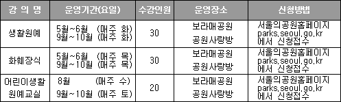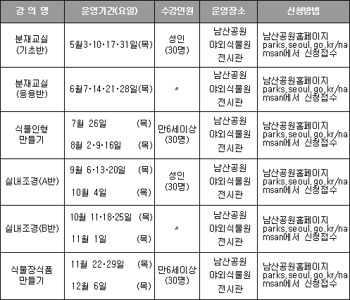 푸른도시를 만든다... 남산 등 5개 공원서 녹화프로그램 운영 베란다를 비롯, 우리의 생활 주변을 푸르게 가꿀 수 있는 녹화교실이 남산, 보라매공원 등에서 열린다. 2007년도 시민녹화교실은 5개 공원에서 18개 프로그램이 운영되고, 식물을 심고 가꾸는 요령 등을 알려준다. 남산공원은 5~6월 분재교실(매주 목요일), 7~8월 토피어리 만들기와 식물인형만들기 교실이 운영된다. 초등학생 및 학부모를 대상으로 동물형태 등을 만드는 토피어리는 인기가 많은 프로그램 중 하나이다. 9~10월에는 테라리움, 수경재배의 요령을 익혀볼 수 있는 ‘실내조경’, 11월에는 식물을 이용해 소품을 만들어보는 ‘식물 장식만들기’ 프로그램이 실시된다. 보라매공원은 5~6월, 9~10월 주 1회씩 실생활에 필요한 원예기초지식을 배울 수 있는 ‘생활원예’와 화훼장식 이론과 실습을 겸한 ‘화훼장식’ 프로그램이 운영된다. 어린이를 대상으로 하는 프로그램으로는 식물재배, 식물의 생육환경 등 생활원예를 배우는 ‘어린이 생활원예교실’이 있다. 수업은 1기와 2기로 나뉘어 1기는 8월(매주 수요일), 2기는 9~10월까지 운영된다. 참여 신청은 서울의 공원 홈페이지(park.seoul.go.kr)에서 선착순 접수 길동생태공원은 ‘야생화 알아가기’와 ‘베란다·실내원예’ 등의 프로그램이 진행된다. 4~5월(매주 목요일)에는 우리나라 산과 들에 자생하는 식물을 알아보고 재배 가능한 식물을 선택해 실습해 보는 ‘야생화 알아가기’, 9~10월(매주 목요일)에는 실내 꽃가꾸기와 실내화단을 만들어 볼 수 있는 ‘베란다·실내원예’ 교실이 마련돼 있다. 참여 신청은 서울의 공원 홈페이지(park.seoul.go.kr)에서 선착순 접수 월드컵공원은 6월 매주 목요일과 9월 매주 금요일, 자연꽃을 활용해 생활용품과 액세서리를 만드는 ‘꽃누르미 만들기’, 9~10월은 실내에서 키우기 적합한 식물을 가꾸는 방법을 익히고, 각종 소품을 이용해 베란다 정원을 꾸미는 ‘그린인테리어’ 프로그램을 진행된다. 이밖에 자연물을 활용한 향기요법, 허브를 이용해 생활용품을 만드는 ‘향기요법교실’이 마련되어 있다. 참여 신청은 월드컵공원 홈페이지에 선착순으로 접수하면 된다. 어린이대공원은 4~5월 ‘분재일반’과 6~7월에는 야생식물 분경과 허브재배요령 등을 배우는 ‘야생화와 허브’ 프로그램이 준비돼 있다. 9월에는 ‘토피어리’, 10~11월은 ‘베란다원예 및 실내조경’이 진행된다. 참여신청은 어린이대공원 홈페이지(www.childrenpark.or.kr)에서 선착순으로 접수.