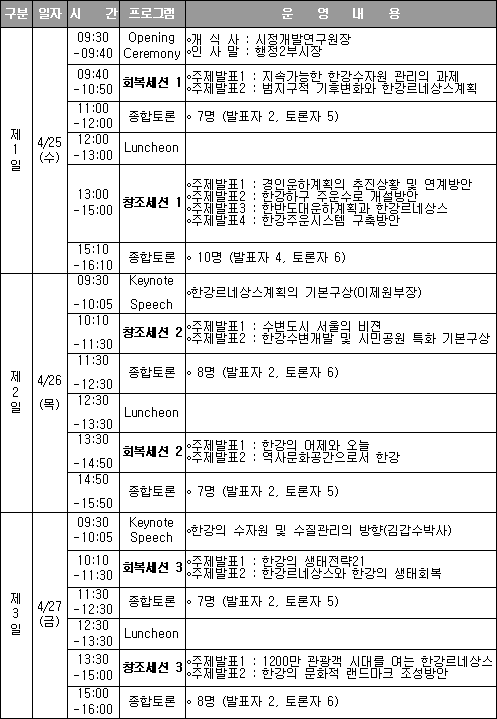 경인운하 타당성 검토, 1200만 관광객 유치방안 등 논의 전문가들이 생각하는 한강의 미래에 대한 그림을 보다 구체화하는 작업이 이루어진다. 서울시한강사업본부에서는 ‘2007 하이서울페스티벌 학술제’의 일환으로 4월 25일부터 27일까지 서울시정개발연구원에서 ‘한강의 창조와 회복’을 주제로 ‘한강르네상스 전문가 워크샵’을 개최한다. 이번 워크샵에서는 창조와 회복의 주제로 나누어 한강르네상스 프로젝트와 관련된 주운계획, 수변 및 12개 공원 특화 계획, 생태전략, 1200만 관광객 유치 등에 대한 다양한 논의가 이루어질 예정이다. 25일에는 단국대 강부식 교수가 ‘지속가능한 한강수자원 관리의 과제’에 관한 주제발표를 하고 서울대 김영오 교수가 ‘범지구적 기후변화와 한강르네상스 계획’에 관해 발표한다. 또 ▷경인운하 타당성 검토결과 및 한강연계방안 ▷한강하구를 활용한 물류시스템 구축방안 ▷한반도대운하계획의 기본구상과 한강연계방안 ▷선박의 한강주운 가능성에 대해 주제발표를 하고 전문가들의 토론이 이루어진다. 한강르네상스 구체적 사업방향 제시 26일에는 경원대 최정권 교수가 해외의 성공적인 리버프런트의 조성사례에 관해 소개하고, 진양교 CA건축사무소 소장이 ‘한강수변개발 및 한강시민공원특성화 방안’에 대해 발표한다. 이밖에 한강의 역사와 문화 그리고 한강의 역사 문화 컨텐츠 활용방안에 대한 주제발표와 토론도 이어질 예정이다. 마지막날에는 경원대 김귀곤 교수가 ‘한강의 생태전략 21’에 관해 주제발표를 하고 공주대 조용현 교수가 ‘한강르네상스와 한강의 생태회복’에 관해 논의한다. 또 1200만 관광객 시대를 여는 한강르네상스 계획과 당인리 화력발전소의 문화공간화 방안에 대해서도 심도있는 논의를 진행할 예정이다.