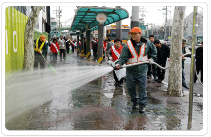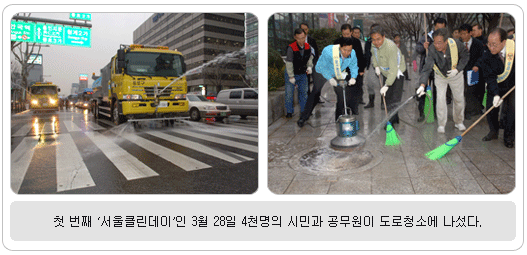 황사·먼지 등 오염물질 제거해 체감 오염도 낮춘다 이달의 서울클린데이에는 종로 5가, 을지로 일대, 용산 서울역~한강대교 북단 등 74개 지역의 차도 454㎞, 보도 82㎞ 구간에 대해 대대적으로 물청소를 하는데, 청소차량 356대가 동원되고 공무원 3,376명, 시민고객 3,432명이 참여한다. 특히 중구, 은평구 등 12개 자치구는 구청장이 솔선수범하여 직접 청소현장에 나설 예정이다. 청소는 가로의 쓰레기 청소에서 시작해 보도의 가로수, 각종 가로시설물, 보도바닥 순서로 물청소하고, 이어 차도 노면청소, 차도 물청소 순으로 진행된다. 한편 황사·먼지·오존 등 대기오염이 심할 때에는 상황에 따라 단계별로 도로 물청소를 실시해 체감 오염도를 낮출 계획이다. 대기오염 경보발령 시에는 즉시 주요간선도로 차도를 물청소해 도로 위 황사먼지를 제거하는데 주력하고, 경보해제 후에는 통행인이 많은 지역의 차도 및 보도, 방음벽, 가로수, 버스·택시 승강장 등 가로시설물 등을 일제히 물청소해 시민들이 오염에 노출되지 않도록 한다. 그런가 하면 오는 5월 16일 자치구 도로물청소 담당 및 운전원 140명이 서울시 인재개발원에서 워크숍을 갖고, 대기오염 상황에 따른 작업 매뉴얼 교육을 받는 등 만반의 준비를 갖춘다. 또한 서울클린데이 운영, 황사 발생시 대응, 민원처리 등 창의적이고 효율적인 우수사례를 발표하고, 서울클린데이를 서울만의 특화된 환경상품으로 육성하겠다는 포부도 갖고 있다. 한편, 서울시 관계자는 “물청소로 인해 물이 튀거나 도로가 미끄러울 수 있고 빨리 달리면 물보라가 생길 수 있으니, 가급적 청소구간을 지날 때는 속도를 낮추고 앞차와의 간격을 충분히 두고 서행해 줄 것”을 당부했다. ■ 문의 : 서울시 환경국 클린도시추진반 ☎ 6361-3341