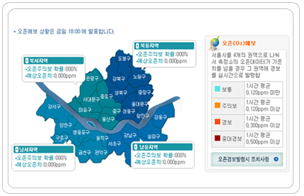 오존예보제 시행, 대기오염정보 음성자동응답시스템 안내 오존농도가 시간당 0.10ppm 이상이 되면 질소산화물, 휘발성유기화합물 등을 다량 배출하는 발전소, 소각장, 도장시설 등의 업소에 음성동보장치를 이용해 오존농도 증가를 알려 가동율 조정 등 협조 요청을 하는 오존농도 사전통보제가 실시된다. 이 뿐 아니라 자치구, 시 교육청 등의 관련기관에 통보해 오존주의보 발령에 대비하도록 하고, 교통방송에는 오존농도가 높은 지역의 차량은 우회하도록 방송요청을 한다. 경보발령은 오존농도의 1시간 평균치가 0.12ppm 이상이면 오존주의보, 0.3ppm 이상이면 오존경보, 0.5ppm 이상이면 중대경보가 된다. 2005년 오존주의보 발령일수는 1일, 지난해는 1일이며, 서울의 지난해 오존 연평균 농도는 0.018ppm이다. 오존주의보 발령 시 시민들은 과격한 실외운동을 자제하고 호흡기 환자, 노약자, 어린이 등은 실외활동을 삼가하며, 가급적 대중교통시설을 이용하는 등의 협조가 필요하며, 오존경보 발령 시에는 발령지역의 모든 주민은 외출을 삼가야 하고, 발령 지역 내 유치원, 학교는 실외학습 중지, 비사업용 승용차·승합차·화물차 등 일부차량의 운행이 제한된다. 오존은 자동차 통행량이 많은 도시지역과 휘발성유기화합물 사용이 많은 지역에서 농도가 높게 나타나며, 오존농도가 높아지면 눈과 목이 따가울 수 있고 두통, 기침 등의 증세가 나타날 수 있다. 따라서 오존주의보 발령기준치인 시간당 0.12ppm 이상이 되면, 오존주의보 발령 상황을 각 자치구, 언론기관, 교육청 등에 통보하고, 각 기관의 담당자 및 학교 교사에게는 발령사항을 핸드폰 문자메시지 전송할 계획이다. 발령상황을 전달받은 기관(방송, 학교, 지하철, 공원, 고궁, 병원, 운동장 등)에서는 이용시민들에게 실외수업 자제, 과격한 실외활동 자제, 차량 운행 자제 등을 권고하게 된다. 오존예보제는 기상예보처럼, 다음날의 오존주의보 발령확률을 매일 오후 6시에 자치구, 언론사 등의 유관기관과 보건환경연구원 홈페이지(http://air.seoul.go.kr)를 통해 발표한다. 또, 이러한 예·경보상황을 대기오염정보 음성자동응답시스템 (319-3030)으로도 24시간 안내할 계획이다.