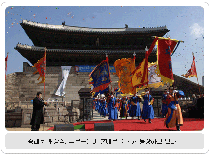 이어 수문군들이 홍예문을 통해 등장해 수위의식 상태로 도열하자 참석자들의 박수가 쏟아졌고, 행사에 참여한 이명박 서울시장과 성낙합 중구청장 등 귀빈들이 홍예문을 처음으로 통과했다. 잠시 후에는 정조대왕이 화성행차 후 홍예문을 통과해 도성으로 들어가는 어가행렬이 펼쳐졌다. 1800년 당시 숭례문을 드나들었던 상인들의 생활사도 재현됐다. 각설이들의 숭례문 통과를 막는 파수대장의 호패 검사는 당시 상황을 고스란히 드러내 흥미를 자아냈다. 매일 오전 10시~오후 4시 조선시대 도성문 파수의식 재현 숭례문 개방 시간은 매일 오전 10시부터 오후 5시까지, 숭례문의 중앙통로인 홍예문을 따라 숭례문을 둘러볼 수 있다. 그러나 2층의 문루(門樓)는 문화재 보존 및 관리를 위하여 개방 대상에서 제외된다. 숭례문에서는 매일 오전 10시~오후 4시 3명의 파수꾼을 30분마다 교대 배치하는 조선시대 도성문 파수의식 재현 행사가 진행된다. 또, 덕수궁 대한문 앞 왕궁 수문장 교대 의식장과 숭례문 광장의 파수 의식 행사장을 오가는 순라의식도 열린다. 토·일요일에는 관람객을 위해 문화유산 해설사가 숭례문의 역사를 설명해 주는 프로그램이 운영될 계획이다.