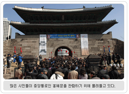 활짝 열린 숭례문 통과한 시민들 탄성 절로 굳게 닫혔던 국보 1호 숭례문이 지난 3일 일반에 개방됐다. 숭례문 개방은 일제 강점기인 1907~1908년 숭례문 좌우의 성벽을 철거하고 전찻길과 도로를 낸 이후 통행이 제한된 이래 100여년 만이다. 지난해 5월 숭례문 주변에 광장이 조성됐지만, 광장을 제외한 숭례문 출입은 제한돼 그동안 시민들은 숭례문을 둘러싼 철제 울타리 너머에서 홍예문을 감상해야 했다. 3일 숭례문 개방 현장에는 이른 아침부터 1천여 명의 시민들이 나와 그동안 국보 1호를 먼발치에서 지켜봐야 했던 아쉬움을 털어냈다. 숭례문 개방은 국보 1호의 귀환답게 화려하고 웅장했다. 이명박 서울시장이 숭례문 개방을 알리는 북을 울리고 곧바로 수문군들이 홍예문(문틀 윗머리가 무지개 모양으로 된 문)을 잡아당기자 100년 만에 빗장을 푼 숭례문이 위용을 드러냈다.