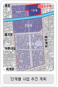 2008년 12월까지 1단계 녹지축 조성 마무리 북악~종묘~남산~관악산을 잇는 도심의 남북녹지축이 조성된다. 종로, 을지로 등 주요 가로를 8개 구역으로 구분, 총3단계로 진행되는 사업 1단계는 종로∼청계천 구간 가운데 세운상가 1/2구간인 폭 70m, 길이 90m로 내년 12월 말 완공 예정이다. 2단계는 남은 세운상가 1/2구간을 포함, 청계천~을지로 구간 폭 90m, 길이 290m로 2012년, 3단계는 을지로~퇴계로 구간 폭 90m, 연장 500m 구간으로 2015년 완공할 계획이다.