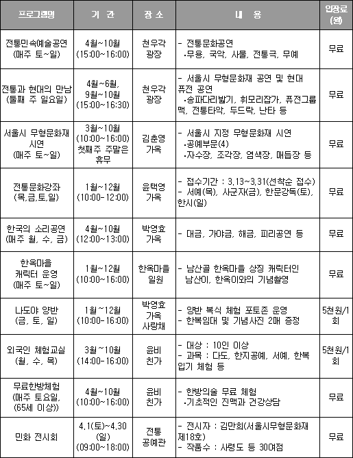 ■ 남산골한옥마을 : 강좌 및 공연프로그램 (☎ 2266-6923)
