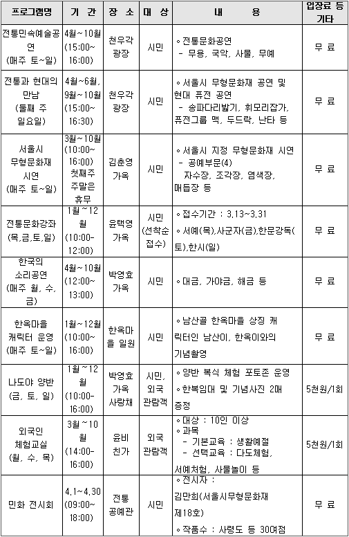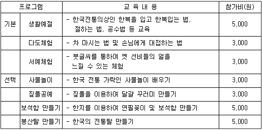 구성돼 있다. 선택 교육은 다도체험, 서예체험, 보석함 만들기, 봉산탈 만들기 및 짚풀을 이용하여 달걀 꾸러미를 만들어 보는 ‘짚풀공예’ 등으로 짜여 있다. 참가자는 이 중 1~2종목을 선택하여 체험해 보는 기회를 갖는다. 특히 지난 4월 3일(월)에는 ANOC총회에 참석차 한국에 방문한 IOC위원 부인 등이 전통문화체험교실에 참여하여 만족감을 표하기도 하였다. 또 이번 14일(금)에는 성균관대학교 성균어학원 학생 79명이 참여해 한국의 아름다움을 체험할 예정이다. ‘외국인 전통문화 체험교실’은 3월부터 10월까지 매주 월, 수, 목 오후 2시에 진행되며, 10인 이상 단체일 경우 시간 조절이 가능하다. 참가를 원하는 외국인은 남산골 한옥마을 홈페이지에서 신청서를 내려받아 이메일이나 팩스로 신청하고, 대상자 선정 통보를 받은 후 참가비를 납부하면 된다.