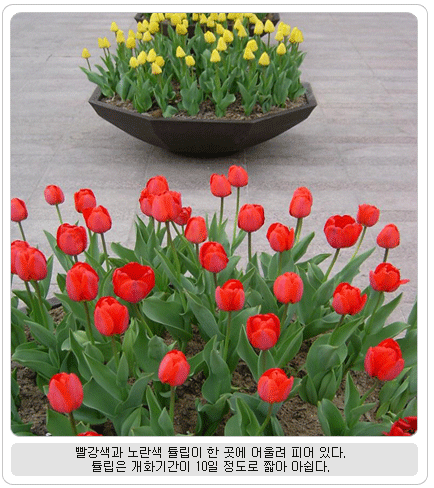 중앙아시아기 원산지인 튤립은 우리나라와 중국에서는 울금향으로 불리어 왔다. 울금은 생강의 일종인 강황이니 튤립에서 생강 냄새가 난다는 뜻일 게다. 예전 왕실에서 드리는 제사 때 쓰는 술로, 이름 그대로 자줏빛이 나는 ‘자주(紫酒)’라는 술이 있는데 바로 울금향으로 빚어 담갔다고 전해온다. 울창주 역시 울금향을 넣어 만든 향기로운 술로 알려져 있다. 튤립은 기르기가 까다로운 꽃이다. 겨울동안 알뿌리를 냉장 보관했다가 새봄에 날씨 변화를 잘 살펴서 심어야 꽃을 볼 수 있기 때문이다. 꽃이 피어있는 기간도 짧다. 우리나라의 기후 조건에선 보통 열흘 정도, 길어야 2주일을 못 넘긴다. 서울광장을 수놓은 튤립의 화려한 자태를 보기 위해선 서두를 필요가 있다. 전시는 20일에 끝난다고 한다. | |