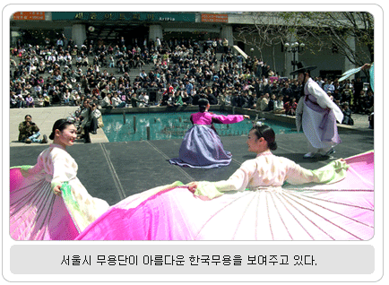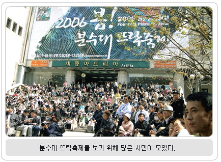 도심의 직장인들은 행복하다. 왜냐하면, 세종문화회관 분수대 광장에서 열리는 ‘2006 봄! 분수대 뜨락 축제’가 있기 때문이다. 축제에 동참하기 위해 점심때 광화문에 있는 친구를 만나 간단히 식사를 하고 바로 세종문화회관 분수대 광장으로 갔다. 그곳엔 이미 많은 직장인이 공연을 보기에 제일 좋은 명당인 세종문화회관 계단에서 커피를 들고 직장 동료와 삼삼오오 모여서 담소를 나누고 있었다. 마침 서울시 국악관현악단과 서울시 무용단의 공연이 있었는데 날씨도 쾌적하고 기온도 적당해서 야외공연을 감상하기에 좋았다. 솔직히 평소에 국악에 대해 별로 매력을 느끼지 못했는데 야외에서 은은히 연주되는 국악의 소리가 청명한 봄 날씨와 어우러진 맛은 일품이었다.
