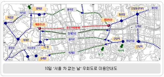 서울시내 모든 시내버스ㆍ마을버스 첫차부터 오전9시까지 무료 탑승 차량으로 꽉 막히고 오가는 인파로 늘 복잡한 세종로~동대문 구간이 시원하게 뚫린다. 서울시는 오는 10일(월)을 ‘서울 차 없는 날’로 정하고, 당일 오전 4시부터 오후6시까지 세종로~흥인지문 2.8Km의 종로구간에 버스와 장애인 셔틀버스를 제외한 모든 차량을 통제하고 서울시 및 자치구 산하 모든 공공기관의 도심 주차장을 폐쇄하기로 하였다. 서울시에 따르면 10일 종로구간 양방향 8차로 중 각 1~2차로는 임시 중앙버스전용차로로, 2~4차로는 보행공간으로 조성하는데 반해 남북간 도로는 차량 통행을 허용하지만 종로로 진입하는 좌, 우회전은 폐지한다고 밝혔다. 이에 따라 충정로(새문안길)에서 종로를 통과하던 차량은 서소문로, 사직로로 우회하여 을지로와 율곡로를 이용하고 왕산로에서 종로를 통과하던 차량은 고산자로, 난계로로 우회하여 을지로, 율곡로, 퇴계로를 이용하면 된다. 종로 주변상가를 이용하는 차량은 청계천로 및 율곡로에서 삼일로, 돈화문로 등 남북간 도로를 통해 도보로 접근해야 한다. 한편 서울시는 안전 휀스 설치 등 차 없는 거리 조성을 위해 10일 오전 1시부터 4시까지 종로 전 구간에서 대대적인 불법 주, 정차 차량 단속 및 견인을 실시한다. 또 ‘서울 차 없는 날’ 운영과 관련 시민들의 불편을 최소화하기 위해 10일에는 광역버스를 제외한 서울시내버스와 마을버스는 첫차부터 오전 9시(탑승 시간 기준)까지 무료로 이용할 수 있게 하였다.