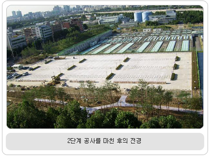 주요 공사 내용을 살펴보면 산책로와 생태연못, 실개천을 만들고 소나무, 잣나무, 느티나무, 벚나무 등 3만여 그루의 나무를 심어 자연의 정취를 만끽하며 거닐 수 있고, 주차장 안에도 12개의 화단을 만들어 도심속에 자연과 어우러진 주차장을 연출하게 된다. 2단계 공사는 102억원을 들여 2005년 12월에 착수하여 1년 11개월 만에 공사가 끝났다. 이에 앞서 2004년 7월에는 10,300㎡ 규모의 1단계 공사를 완료하였고, 올해 6월에는 탄천 물재생센터와 주택가와의 경계에 20~30m의 폭으로 600여 미터의 수림대를 조성하고 산책로도 만들었다. 한편, 49,700㎡ 규모의 3단계 공사는 올해 1월에 시작하여 2009년 11월 완공을 목표로 한창 진행 중이며, 축구장, 농구장, 테니스장 등 체육시설과 공원이 들어서게 된다. ■ 문의 : 서울시 건설안전본부 시책사업부 ☎ 02-3708-2459 |