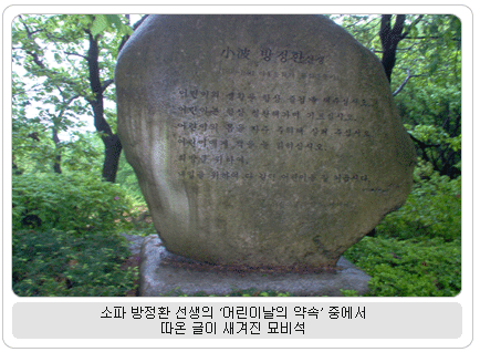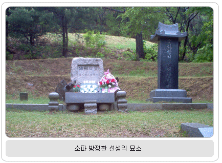 글로 소파 선생의 인품을 대변하고 있었다. 서예가 정주상 그분은 한국이 낳은 문화 위인으로 작가로서, 시인으로서, 아동 문학의 동요·동화·동극 등 각 분야에서 글을 남겼고, 편집인으로, 연사로, 동화 구연가로, 어린이 운동의 선구자로 많은 공적을 남겼다. ‘어린이’라는 말을 만들었고, ‘어린이날’을 제정했으며, 어린이에게 경어를 처음 쓰는 등 어린이 사랑을 신앙으로 하여 아동 권익 운동에 몸을 바쳤다. 이 모든 활동은 우리의 국권을 찾기 위한 독립운동의 일환이었기 때문에 더욱 빛이 나는 선각자이시다. 돌아오는 길에 여러 선각자의 묘소가 좀 더 정성 드려 모셔졌으면 하는 아쉬움이 있었다. | |