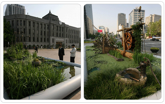 창포, 수련 등 수생식물 50종 10월까지 전시 답답했던 도심에 습지가 생겼다. 창포, 수련, 부들, 연 등 각종 수생식물을 가득 담은 습지는 다름 아닌 서울광장 한편에 생긴 수생식물 전시장이다. 이곳에서는 창포, 수련 등 50여종에 이르는 수생식물 5천415포기가 황포돛단배와 물레방아, 마차, 돌수각 등 각종 전통 소품들과 함께 전시되고 있다. 지하철 1호선에서 시청으로 나오는 입구에 마련된 전시장에는 3m×10m 규모의 수생식물 식재용 수조 3조가 설치돼 있고, 수생식물 해설판이 50여종에 이르는 수생식물을 친절히 안내한다. 때문에 인근 직장인들에게는 좋은 볼거리가 될 뿐 아니라 서울광장으로 소풍 나온 어린이들의 자연학습장으로도 손색없다.