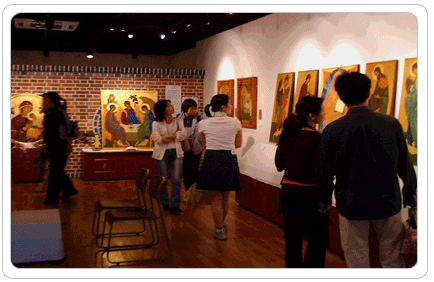 지난 일요일 오후 명동성당 전시관에서 열리고 있는 이콘(Icon) 전시회에 다녀왔다. 이콘이란 우리가 성당에서 자주 보게 되는 예수 그리스도, 성모 마리아를 위시한 성인, 성녀들의 형상을 그려 놓은 그림들을 말한다. 명동성당은 문화축제로 사람들이 붐비고 있었다. 그들 사이로 전시관을 찾아 발걸음을 재촉했다. 성당 바로 옆의 전시관을 찾아 올라가니 “영혼의 빛을 따라서”라고 현수막에 쓰인 문구가 눈에 들어왔다. 이 말처럼 전시관 문을 열고 들어간 그곳은 눈부실 정도로 빛나고 있었다. 그리 크지 않은 전시관을 환하게 비추고 있는 것은 벽에 걸린 이콘이었다. 이콘을 만드는 안료를 전시해 놓았는데 단순한 몇 가지 색만이 들어가는 게 아니라 여러 색이 조화를 이루며 그림의 빛을 강조하는 듯했다. 바로 옆에 전시된 유리 틀 안에는 이콘을 제작하는 도구와 판을 전시해 놓았다. 간략하게 만드는 방법을 살펴보면 먼저 나무판에 아교와 천을 입히고 그곳에 회반죽을 바른다. 스케치를 하고 안료를 바른 후, 마지막은 금박으로 마무리를 한다. 이런 정성스러운 과정을 통해 이콘의 화려한 분위기가 탄생한다.