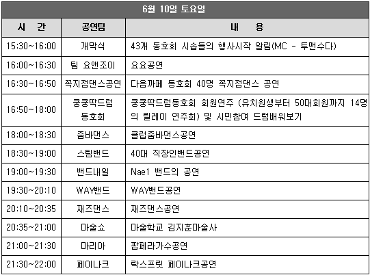 한편 오는 13일 토고와의 월드컵 첫 경기를 앞두고 ‘꼭짓점댄스 배우기’, 커뮤니티와 함께하는 응원전인 ‘미리월드컵’ 등 월드컵 승리기원을 위한 뜨거운 열기와 함성을 이어갈 수 있는 다양한 응원 프로그램도 준비된다. 서울시 한강시민공원사업소 박명진 기획과장은 “올해로 3회째를 맞이하는 ‘2006 강변 카페 페스티벌’이 동호인과 시민이 하나가 되어 한강에서만 즐길 수 있는 독특한 주제의 시민주도형 축제로 자리를 잡아가길 기대한다”고 밝혔다. 6월의 여유로운 주말, 뚝섬 벽천마당을 방문하는 가족단위의 시민들은 다양한 온ㆍ오프라인 동호회들의 여가문화 노하우와 유익한 정보를 체험하고 얻을 수 있는 좋은 기회가 될 것이다. ‘2006 강변 카페 페스티벌’은 각 카페의 부스는 오후 2시부터 7시까지, 무대는 오후 4시부터