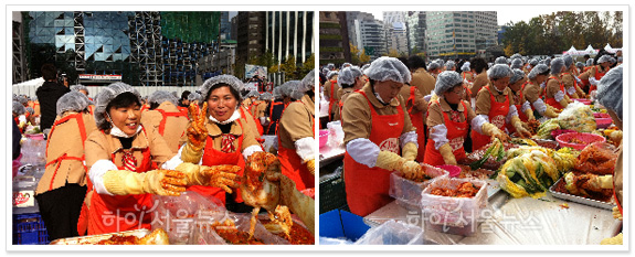 [서울시 하이서울뉴스] 8일 서울광장이 사람들로 북적거렸다. 이날 서울광장에서는 한국야쿠르트가 주관하는 '사랑의 김장나누기' 행사가 진행됐다. 올해로 11년째인 ‘사랑의 김장나누기’ 행사엔 배추 200t에 양념 70t이 사용됐다. 이는 5t 차량 기준으로 54대(배추 40대, 양념 14대) 분량이다. 또 생굴, 젓갈, 소금, 밤, 잣, 대추 등 순수 우리 농ㆍ수산물 20여종의 양념이 들어갔다.