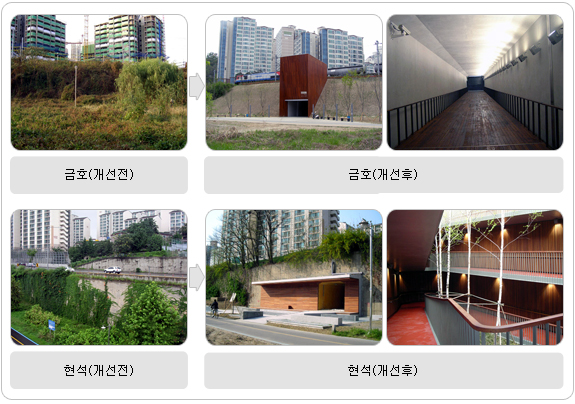 한강공원을 찾는 시민고객의 발걸음이 한결 가벼워진다. 서울시는 지난 25일 성동구 금호나들목과 마포구 현석나들목 두 곳을 한강 특성에 맞는 자연친화적 공간으로 바꾸어 선을 보였다. 이번에 새 단장한 두 곳의 나들목은 서울시가 한강르네상스 프로젝트의 일환으로 추진 중인 34개 나들목 공사 가운데 첫 번째 작품. 한강공원의 이미지 통합 디자인 계획에 따라 전문디자이너가 참여하여 환경친화적이고, 품위있는 자재로 밝고 쾌적한 공간으로 조성한 것이 눈길을 끈다. 폭 4m, 길이 60m의 금호나들목은 목재테크와 천정으로 향한 간접조명으로 기존의 차갑고 칙칙한 터널 이미지를 자연광이 비치는 것처럼 느끼게 하고 있다. 폭 4m, 길이 33m의 현석나들목은 숲도 있고 터널도 있고 쉼터까지 갖춘 공간으로 러시아의 호박방을 연상케하는 색상을 사용하여 이용객 모두에게 ‘부자되십시오’라는 의미를 담고 있다. 서울시는 나들목이 새로운 공간으로 바뀌면 지역주민들을 위한 각종 행사와 축제로 자연스럽게 문화벹트가 구축될 것으로 기대하고 있다. 한강사업본부는 금호나들목과 현석나들목 준공을 신호탄으로 여의도, 개화, 노유, 이촌나들목도 내년에 추가로 개장할 계획이다.