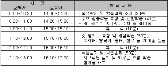 농업의 소중함도 느껴보고 또한 서울특별시농업기술센터에서도 도심 속에서 자연을 체험하고 농업의 소중함을 배울 수 있는 자연체험학습 프로그램인 ‘어린이 자연학교’를 여름방학동안 초등학생 및 학부모 840명을 대상으로 7월 25일부터 8월 25일 까지 운영한다.