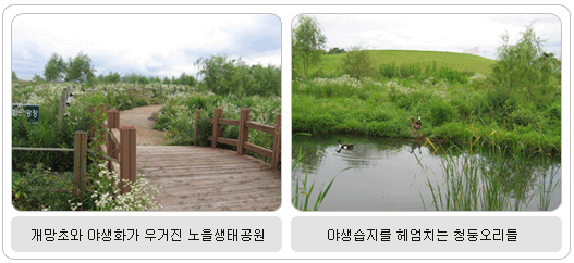 정이 넘치는 가족의 형태로 서있는 장승들을 지나 언덕 위의 생태공원에 들어선 순간, “푸드득” 하며 커다란 꿩이 날아오르는 것이 보였다. 사람의 손때가 묻지 않은 자연 그대로 무성한 하얀 개망초 꽃과 온갖 들꽃이 어우러지고, 벌과 나비, 풀벌레가 자유롭게 활개 치는 노을생태공원에서는, 야생 습지 위를 유유자적 하게 헤엄치는 청둥오리들도 만날 수 있었다. “노을생태공원을 이용하는 사람들이 많은가요?” “아직은 별로 알려지지 않아서 방문객이 그렇게 많지 않아요. 노을공원이 생태공원으로 보다 노을공원골프장으로 더 알려져서 그런지 주로 노을공원골프장으로 오는 분들이 많지요.” “생태공원을 찾는 사람들도 많지 않은데, 안내원과 함께 동행해야하는 이유는 뭐지요?” “그건 정해진 산책로를 벗어날 경우, 바로 옆에 있는 노을공원 골프장의 골프공에 맞아 다칠 위험도 있고, 노을공원이 야생의 모습을 그대로 보존하는 쪽에 초점을 두다보니까 가끔씩 벌레나 뱀 같은 것을 만나서 놀랄 수도 있기 때문이에요.” 상큼한 초록의 신선함이 넘치는 5Km 정도의 생태공원 산책로를 1시간 쯤 걷는 동안, 말할 수 없이 편안했고 쾌적한 향기를 듬뿍 마신 것처럼 몸에 활력이 느껴졌다. | ||