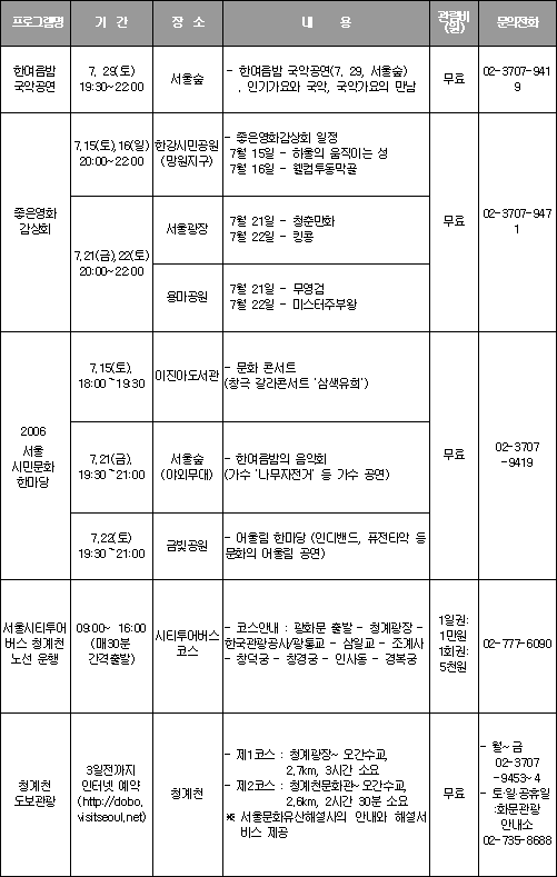 눅눅하고 더운 여름, 짜증이 날 법도 하련만 방학을 앞둔 아이들은 그저 반갑기만 한 계절이다. 알차고도 재미있는 방학을 위해서는 무엇보다 어른들의 세심한 계획과 보살핌이 중요하다. 먼 곳으로 나들이는 부담스럽고 집안에만 있기에는 무료하다면 다양한 문화행사를 찾아 새로운 분위기를 만끽해보자. 서울 시내 공연장과 공원, 미술관 등에서는 볼만한 영화나 공연, 전시를 준비해놓고 손님들을 기다리고 있다. 한낮에 비해 열기가 줄어드는 저녁 무렵은 야외음악공연이 제격이다.