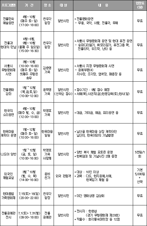전통민속예술 공연, 양반체험전, 전통공예관 전시, 한여름밤 가족영화제 등이 골고루 열린다. 상시 공연이 많기 때문에 미리 알아보고