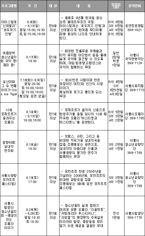 일년만의 여름휴가를 한껏 즐길 수 있는 8월에도 서울 도심 곳곳에서 다채로운 문화행사가 연이어 펼쳐진다. 서울광장, 서울시립미술관, 서울역사박물관, 남산골 한옥마을, 운현궁, 서울열린극장 창동 등 집 가까운 곳을 골라 문화 프로그램을 즐기면서 더위를 피하는 것도 좋겠다.