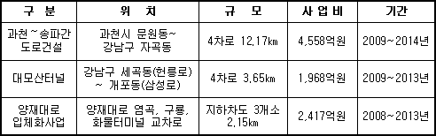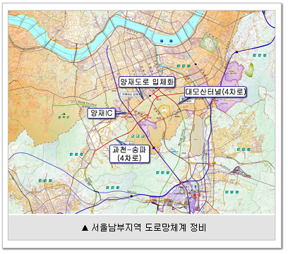 서울 강남 교통흐름이 빨라진다 서울의 대표적 상습정체 지역인 양재IC 주변 교통문제를 개선하기 위해 서울시는 송파신도시 초입인 강남 자곡동과 과천 문원동을 연결하는 폭 4차로 길이 12.17km의 ‘과천~송파 간 도로’를 2014년까지 건설한다. 또, 양재대로 교차로에는 지하차도를 설치해 강남순환도로 개통에도 대비할 계획이다. 이는 송파신도시 등에 따른 교통량 증가에 대비한 것으로, 서울 남부지역 도로망체계를 근본적으로 개선하기 위한 것이다. 도로망을 격자형으로 정비하는 서울 남부지역 도로망체계 정비계획은 대모산으로 단절된 헌릉로와 삼성로를 연결하는 폭 4차로 연장 3.65km의 ‘대모산터널 건설사업’을 비롯, 염곡교차로 등 양재대로상의 정체 교차로에 지하차도를 설치하는 ‘양재대로 입체화사업’을 포함한다.