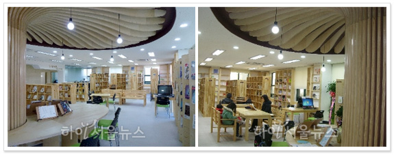 신발을 벗고 들어가는 4층 어린이 열람실 안. 나무 냄새와 새 책 냄새가 가득하다. 오른편으론 원목 서가가 있고 왼편으론 서가에서 자신의 마음에 쏙 든 책을 뽑아 들고 책을 읽을 수 있도록 높낮이를 달리하는 의자들이 놓여 있다. 혼자 혹은 친구들과 모여 앉아 책 읽기에 푹 빠져 있는 아이들의 모습과 아이를 동반한 엄마들이 아이에게 책을 읽어 주는 모습들이 눈에 띈다. 열람실 한 가운데로는 큰 원을 만들 수 있는 개별 의자들이 놓여 있고, 조용히 자신만의 공간에서 책을 읽을 수 있도록 창 측을 향해 책상이 놓여 있기도 하다. 마음에 드는 책을 골라 마음에 드는 공간에서 편안하게 책을 읽을 수 있는 분위기. 좀처럼 공공도서관에서는 보기 힘든 풍경이다. 창문마다 위쪽으론 나무 밑에서 책을 읽는 분위기가 나도록 녹색 나무들을 원목으로 형상화 해 놓았다.