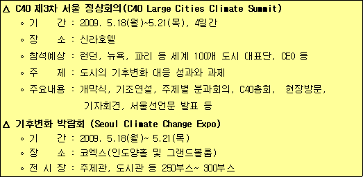 10월 1일부터 내년 1월 5일까지 작품 공모 내년 서울에서 열리는 ‘C40 제3차정상회의ㆍ서울기후변화박람회’를 앞두고 서울시가 기후변화대응 시민실천 UCC를 공모한다. 응모 기간은 10월 1일부터 내년 1월 5일까지 이며 서울시 동영상 홈페이지 WOW 서울을 통해 응모작품을 제출하면 된다. 응모자격에 제한은 없다. 작품은 ‘시민들의 기후변화 대응과 과제’를 주제로 캠페인형 광고, 꽁트 형식 등 서울에서 열리는 C40 제3차정상회의 및 박람회를 홍보할 수 있는 내용이어야 한다. 응모작품 분량은 5분 내외이며 wmv, swf, flv, aasf 파일 형식으로 제출하면 된다. 입상작은 대상 1명, 최우수상 2명, 우수상 3명, 장려상 10명을 선정하여 서울특별시장 상장과 상금을 수여한다.