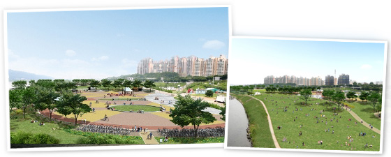 “한강시민공원이 달라진다” … 한강 르네상스 한강공원 특화사업 시민고객들의 도심 속 휴식처로 사랑받아온 한강시민공원이 변신 중이다. 한강 르네상스 프로젝트의 핵심 사업 중 하나인 한강공원 특화사업을 통해 고품격 수변도시 서울의 대표적 관광명소로 탈바꿈한다. 반포, 뚝섬, 여의도, 난지 한강공원은 이미 공사에 들어가 내년 10월이면 몰라보게 달라진 다. 지난 4월 착공한 반포 한강공원의 경우 한강 르네상스 프로젝트의 첫 결실인 세계 최초 교량형 낙하분수 ‘반포분수’를 지난 달 완공, 화려하고 웅장한 자태를 시민고객들에게 선보이기도 했다. 지난 7월 공사를 시작한 뚝섬 한강공원은 회색 콘크리트를 벗은 자연형 호안 등 친환경 수변공간으로 조성하고, 8월 착공한 여의도 한강공원은 놀이, 요트, 레저 거점으로 바꿔 한강 수상레포츠의 메카로 만든다는 계획이다. 이어 9월부터 공사에 들어간 난지 한강공원은 자연과 사람이 함께 숨쉬는 친환경 생태공원으로 복원하고, 접근성을 높여 시민고객들의 이용이 더욱 편리하도록 업그레이드한다. 서울시는 이미 착공한 4개 지구와 광나루 한강공원을 비롯, 이촌, 잠실, 양화 한강공원 특화사업을 내년 중에 추진할 예정이다. |