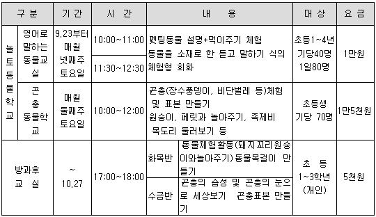 어린이대공원에서는 이달 23일부터 매월 넷째주 토요일 영어로 동물체험을 하는 ‘영어 동물교실’을 신설, 운영한다. 초등학교 1~4학년을 대상으로 이루어지는 ‘영어 동물교실’은 동물원에서 펫팅과 먹이주기 등을 생활영어로 진행한다. 1시간 동안 이루어지는 교육은 어린이들이 영어에 대한 재미와 흥미를 유발할 수 있도록 묻고 답하기 식의 자연스러운 생활영어로 진행하므로 영어를 처음 접하는 어린이도 쉽고 재미있게 배울 수 있는 프로그램이다. 수강학생에게는 영어수료증이 제공되므로 접수 시 영어 이름을 남겨야 한다. 매월 둘째 주 토요일에는 초등학생을 대상으로 장수풍뎅이, 비단벌레, 사슴벌레 등의 곤충습성 및 표본 만들기와 원숭이, 페릿 등 동물과 놀 수 있는 체험프로그램인 ‘곤충 동물학교’를 운영한다. 또 평일에는 초등학교 저학년을 대상으로 ‘방과 후 프로그램’을 신설, 운영한다. 초등학교 저학년 과정과 연계하여 화, 목요일에는 ‘나에게 어울리는 동물 목걸이 공작 교실’, 수, 금요일에는 ‘곤충 표본만들기’ 교실을 진행한다. 10월27일까지 운영하는 방과 후 교실은 오후 5시부터 1시간 동안 진행되며 만든 작품은 집으로 가져가면 된다. 어린이대공원에서 운영하는 프로그램 참가 희망자는 서울시설관리공단(www.sisul.or.kr) 홈페이지로 신청하면 된다. (문의: 서울시설관리공단 어린이대공원운영센터 ☎02-450-9381~2)