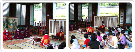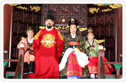 지난 토요일, 우리 가족은 아주 특별한 체험을 했다. 경희궁의 ‘궁중의 일상’ 행사 중 궁중 의상을 입고 가족사진 촬영을 하는 ‘나도 왕실가족’에 선정되어 조선시대의 왕실 가족 체험을 하게 된 것이다. 상반기(5월6일~6월25일), 하반기(9월2일~10월29일) 매주 토ㆍ일요일 오후 2시 경희궁의 숭정전과 자정전에 가면, 조선시대 왕과 그 가족들의 하루를 엿볼 수 있는 ‘궁중의 일상’ 프로그램이 진행된다. 왕이 아침에 일어나 어머니에게 문안을 드리러 가는 것을 시작으로 ‘왕실의 다례’, ‘왕가의 산책’, ‘왕세자 교육과정인 서연’ 등으로 구성된 궁중의례 재현 행사는 500년 조선의 뿌리는 역시 ‘효’와 ‘교육’이라는 것을 자연스럽게 알려주고 있다. 왕세자의 서연을 보고 나서 ‘小學’을 읽어보고, 우리 가족은 준비된 왕족의 의상으로 갈아입었다. 왕은 수염까지 붙이고, 고증에 따라 속옷부터 제대로 갖추어 입도록 운영 요원들이 곁에서 꼼꼼하고 친절하게 도와주었다. 처음에는 부담스럽기도 했지만, 막상 한복을 입고, 머리까지 완벽하게 하고 나니, 타임머신을 타고 조선시대로 돌아가 근엄한 왕비가 된 듯한 느낌이 들었다. 숭정전 안에 들어가 왕의 가족이 된 기분으로 멋지게 촬영을 마치고 왕자, 공주가 된 두 아이와 뒤뜰도 함께 걸어보았다. 아이들도 학교에 가서 색다른 체험을 친구들에게 자랑하겠다며 매우 들떠보였다. 이날 디지털 카메라로 찍은 사진은 바로 메일로 보내주었고, 잘 나온 가족사진은 액자로 제작하여 후에 소포로 보내준다고 한다. 돈을 주고도 할 수 없는 멋진 체험을 온 가족이 하게 되어 너무 즐거웠고, 우리 역사에 대해서도 다시 한번 생각하게 하는 의미 있는 시간들이었다.