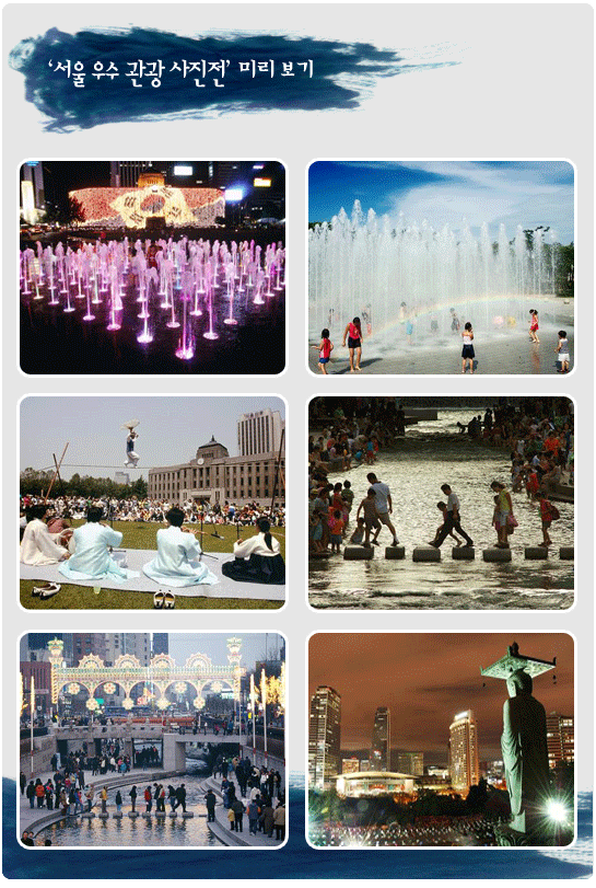 대상 부문 한상근씨 등 총 32명 수상 독특한 매력을 지닌 서울의 모습을 널리 알리고 세계도시 서울을 홍보하기 위해 마련한 이번 행사의 주제는 포토에세이 ‘100일간의 서울스토리’이다. 처음 시도된 이번 스토리텔링 공모전은 120개 스토리에 498점의 사진이 접수되어 관련 전문가로 구성된 심사위원회의 엄격한 심사를 거쳤고, 총 32명의 수상자를 선정했다. 대상 수상작인 한상근의 ‘아름다운 청계천’은 주변 조형물과 어우러진 청계천의 다양한 모습을 담았고, 금상 수상작인 정철재의 ‘서울의 명소’는 도심 속 봉은사 미륵대불, 창덕궁 부용지 등 사람들이 즐겨찾는 서울의 명소를 카메라에 담았다. 입상작품은 10월 1일까지 서울광장에 전시되며, 관광안내책자나 국내외 전시회 등에 서울의 홍보용 이미지로 활용될 계획이다. 문의 : 서울시 관광과 ☎ 3707-9468 |