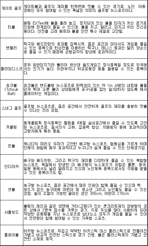누구나 손쉽게 참여할 수 있는 게 뉴스포츠의 장점 뉴스포츠란 국제적으로 규칙이 통일된 전통적 스포츠와는 달리 종목의 다양성, 시설과 용구의 단순성, 규칙의 유연성, 장소의 개방성으로 인해 누구나 배우기 쉬운 새로운 형태의 스포츠이다. 특히 공간이 넓지 않아도 충분히 즐길 수 있고, ‘주체적 참여’라는 즐거운 가치를 추구한다. ‘뉴스포츠 체험 한마당’은 그동안 동호인 중심으로 일부에게만 알려졌던 다양한 형태의 뉴스포츠 종목들을 자세한 설명과 함께 체험하면서 배우고 즐길 수 있는 행사이다. 참가비는 무료, 참가 희망자는 9월23일 토요일 오전 10시~오후4시까지 언제든 월드컵공원 평화광장으로 오면 된다. ■ 문의 ☎ 3707-9537(서울시 문화국 체육과)